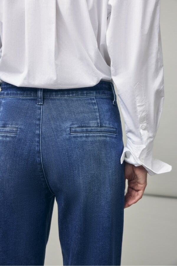 De broek is vervaardigd van een mooie denim stretch katoen met elasthan. Dit vrouwelijke model heeft steekzakken voor en paspelzakken achter op de broek.