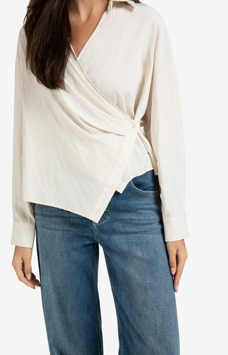 Deze elegante blouse is ontworpen met een flatterende overslag en een licht getailleerde pasvorm. De zachte stof valt soepel om het lichaam en zorgt voor een vrouwelijke uitstraling. Afgewerkt met een klassieke kraag, lange mouwen met manchetten en een subtiele knoopsluiting aan de zijkant. Ideaal voor een stijlvolle, moderne look. Het model is 175 cm en draagt maat 36.