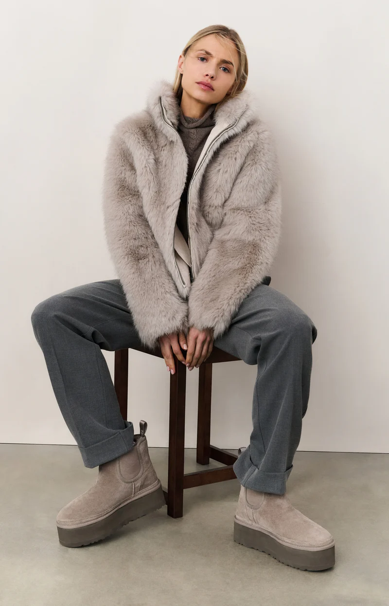 Deze comfortabele jas is gemaakt van zacht nepbont en heeft een opstaande kraag en een verborgen ritssluiting aan de voorzijde. De normale pasvorm en lange mouwen zorgen voor een elegante uitstraling. Een stijlvol item dat warmte biedt en makkelijk te combineren is met zowel casual als chique looks.